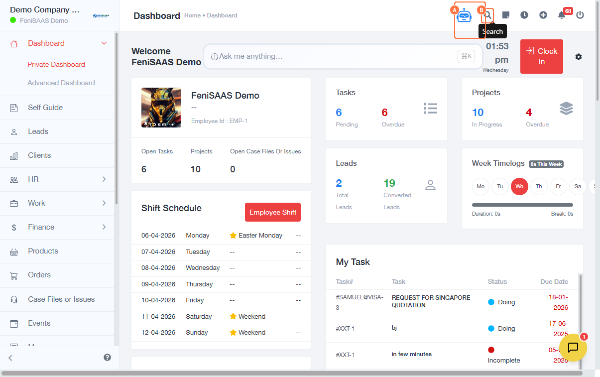 • Where can I clock in from the dashboard?