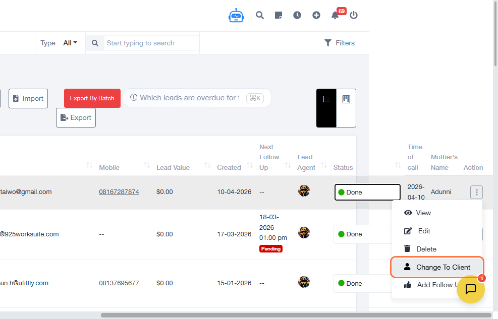 This guide explains how to update a lead’s status and convert the lead into a client in the CRM module. This process ensures that qualified leads are properly transitioned into active clients for business operations.