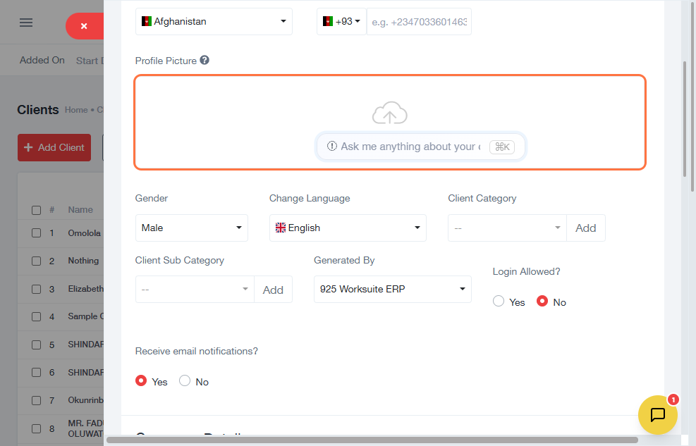 This guide explains how to add and manage client details in the Client Management module within 925Worksuite ERP.