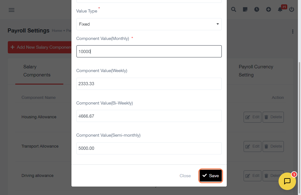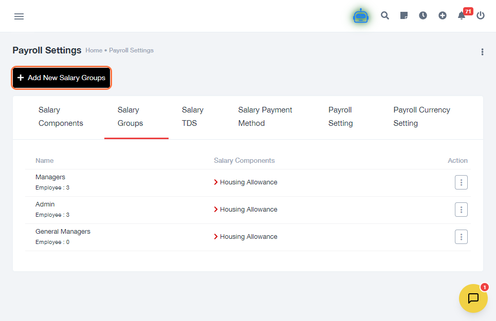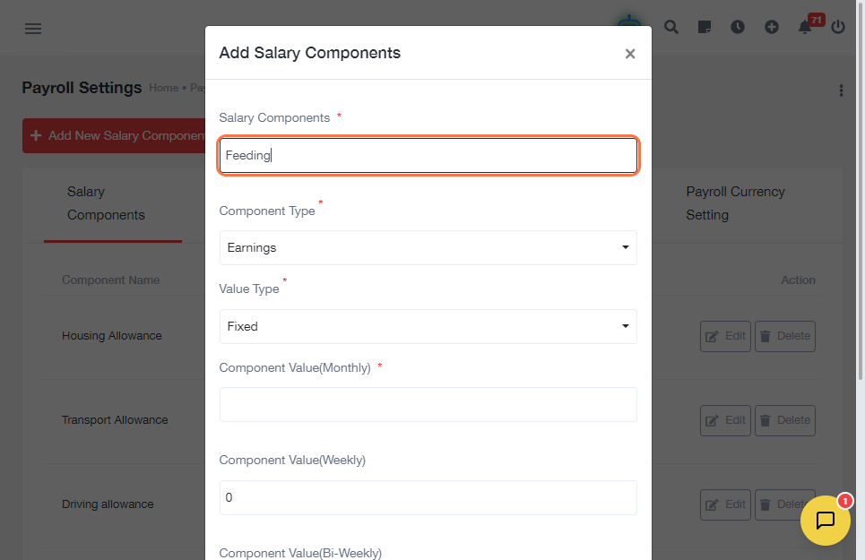 Create salary components, group them, and set payroll currency in Payroll Settings.