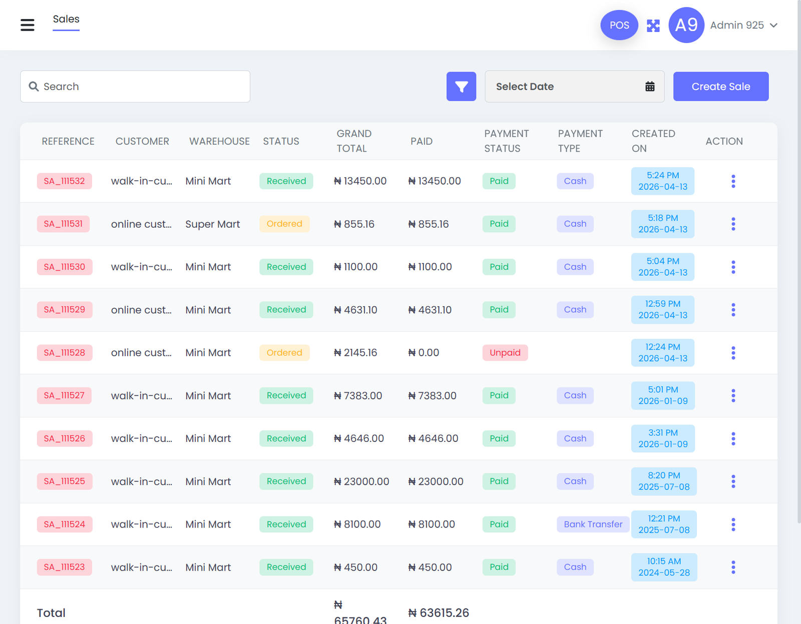 This page displays all sales transactions for the day